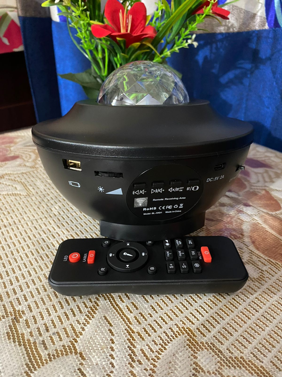 Functions: LED Projector light, Music Speaker, Bluetooth, Remote control